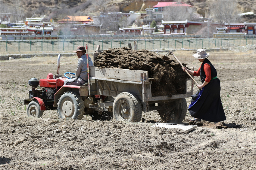 一大早,村民絨布夫婦將去年收集曬干的一袋袋牛糞裝在拖拉機上,開著拖拉機駛向自己的3畝地旁。絨布緩慢的提起液壓操作桿至45度,妻子擁青在后面用鏟子將牛糞灑在沉睡了一冬的土地上,空氣中彌漫著一股淡淡的牛糞味。