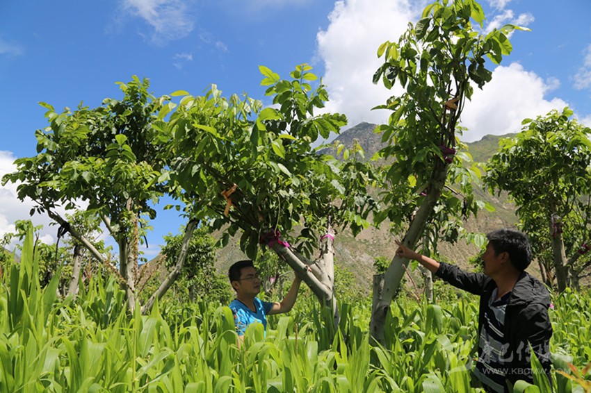 “一畝地最多栽種25棵,過密了只有數量沒有質量;老品種要嫁接新品種,不改良沒質量沒產量。”8月23日,巴塘縣環林局總工程師肖慶喜正在該村檢查去年進行嫁接改良的核桃苗。