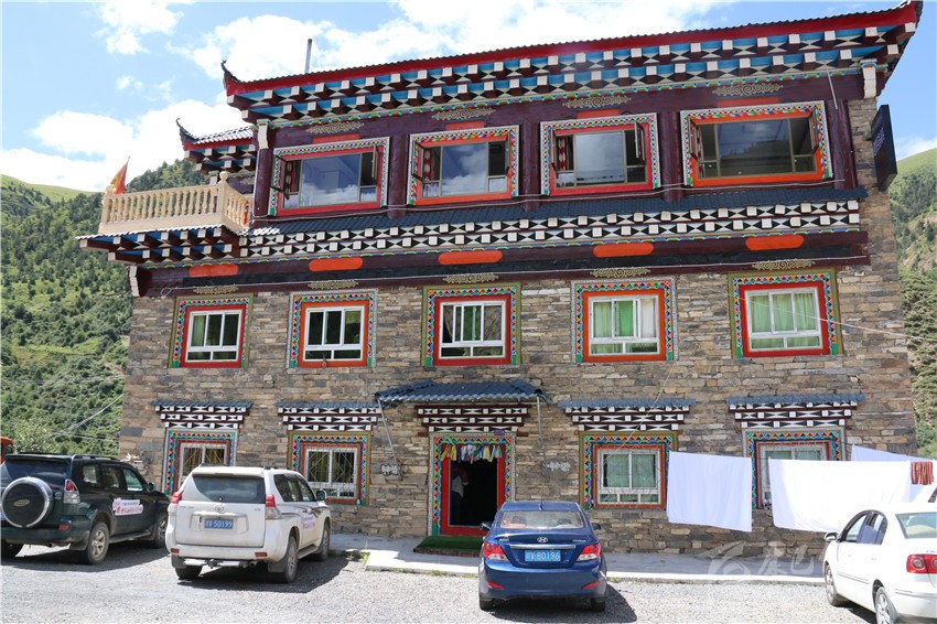 該酒店三樓一底,集餐飲、停車、住宿為一體,設單標間和套房共計22間38個床位,雇傭了3名當地村民幫工,院內甚至配套了超市和茶樓;藏文化元素俯仰皆是,雕梁畫棟,規模配備,儼已成為全縣鄉鎮一道亮麗風景。不論淡旺季,每間房價188元至258元不等。夏季正值入住高峰期,8月以來,幾乎天天客滿。