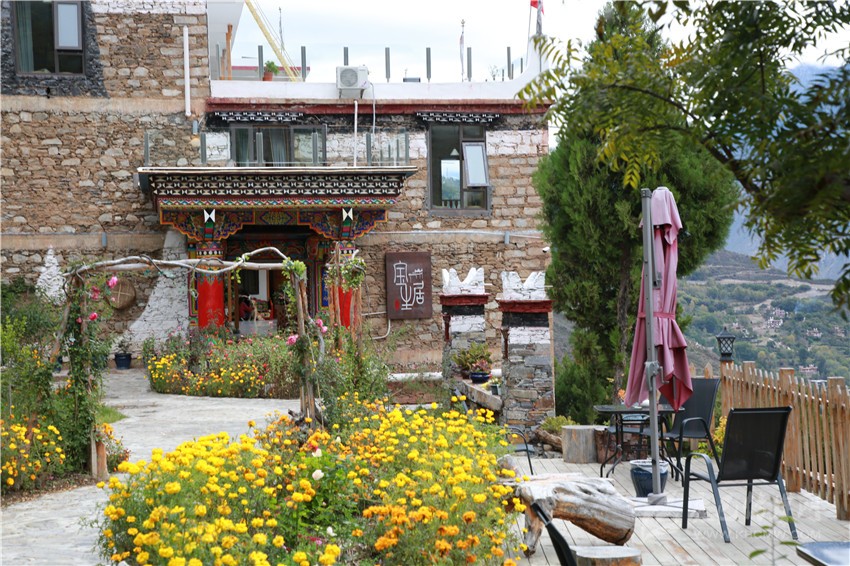 劉國芳告訴記者,花筑田園酒店的誕生,源于她的兒子和廣東東莞幾名游客的一段佳話,兒子安俊杰在跑成都到亞丁包車業務的時候,認識了包車到亞丁的東莞游客趙雯、常妹、千麗、雙燕和成都的峰哥,一路上,開朗的安俊杰博得了客人的信任和好感。安俊杰邀請她們到甲居藏寨作客。幾位客人到甲居考察后,立即表示愿意投資在聶呷鄉開辦鄉村酒店。劉國芳請示縣鄉領導同意,決定將自己的自留地拿出來合資開辦酒店。5位客人立即出資10萬元用于整修道路,隨后出資100萬元,于2016年按照鄉村酒店的標準開始修建花筑田園酒店。酒店共有18個房間,建筑突出了丹巴嘉絨風格,以玫瑰、菊花、薰衣草等花卉為主,集觀賞、休閑、康養為一體,增強了游客的體驗度和舒適感。2018年5月酒店開門迎客,到今年10月已盈利50多萬元。