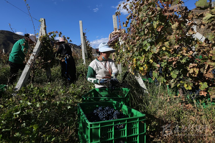 正在采摘葡萄的熱宮村村民擁忠告訴筆者,她家有7畝土地租賃給亞丁紅酒莊種植釀酒葡萄,每畝獲得土地租賃費用1500元,她在葡萄種植園打工,每天100元、每年打工100天,兩項相加收入達2萬余元。