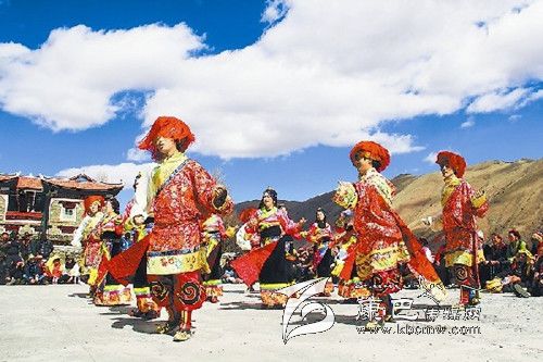 康定縣呷巴鄉上呷村的村民跳起歡樂的舞蹈,喜迎藏歷新年。