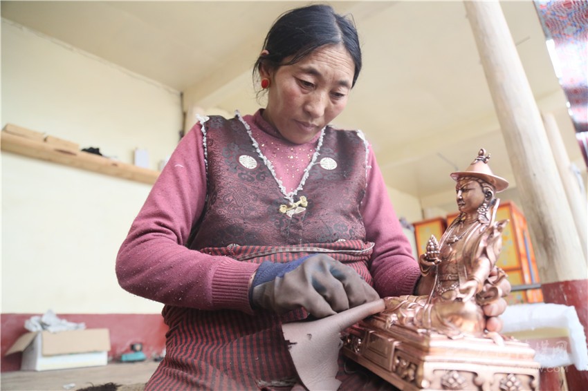 手工藝者布姆正在打磨銅鑄佛像。靠手工技藝,布姆有著穩定收入,于去年實現了脫貧。
