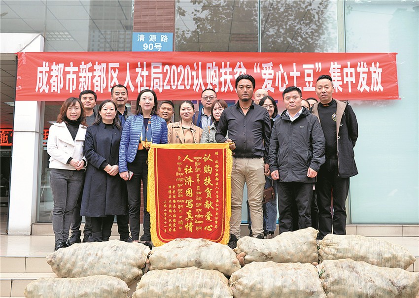 “感謝你們幫助認購3萬余斤土豆……扎西德勒!”11月6日上午8點36分,“愛心土豆”車隊剛在新都區人社局停車場停穩,降央吉村一個躍步下車,為等候多時的人社局送上“認購扶貧獻愛心、人社濟困寫真情”的錦旗。