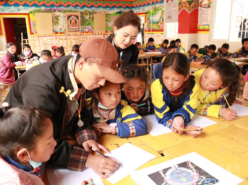 圖為嘎瑪嘎孜派唐卡傳承人教學生畫唐卡。