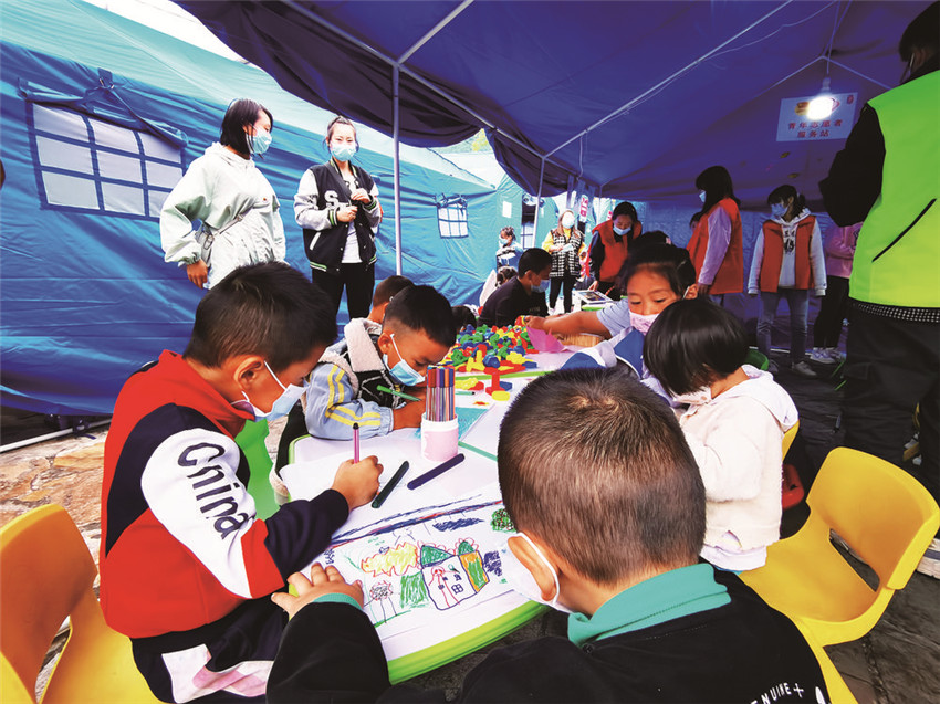 “這頂帳篷中充滿了孩子們的歡聲笑語,這在地震災區就是最動聽的聲音。”共青團甘孜州委統戰社會聯絡部部長澤仁娜姆介紹,地震發生后,團州委第一時間組織3193名志愿者,24支青年突擊隊參與應急志愿者工作,并在磨西鎮貢嘎廣場分配38名志愿者參與后勤保障工作,其中5個人便成為了“青青兒童樂園”里的“保育員”,“孩子們可以在這里畫畫、做游戲,還能在老師輔導下學習,他們不安的情緒也得到安撫,臉上的恐懼也逐漸被微笑取代。”