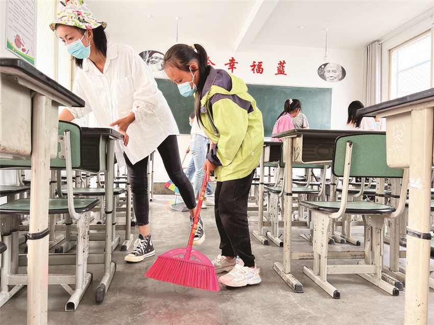 在學校一樓走廊,記者看到墻壁上貼滿了孩子們自制的民族團結手抄報和五十六個民族一家親的畫作。瀘定橋小學副校長杜德琴告訴記者,這是學校開展鑄牢中華民族共同體意識主題教育實踐活動的內容之一。“這些都是老師、家長和學生一起完成的,‘團結’與‘奮進’已深深印刻在瀘定橋小學每一個人的言行中,我們是愛的傳遞者,我們是在以實際行動踐行校訓。我希望災區的孩子們能盡快走進學校,繼續學業。”