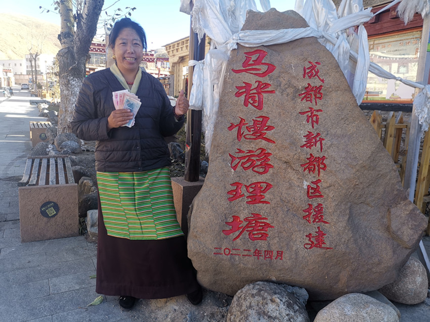四郎卓瑪在現金分紅后在項目石刻前留影。