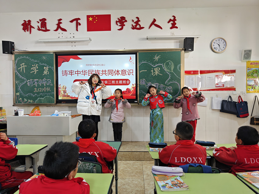 “同學們,新學期新起點,沐浴著紅城綠谷春的氣息,我們定要同努力、共奮進,健康成長,揚眉‘兔’氣!”典禮一結束,學生回到教室后,各班班主任便結合班級情況,開展以“鑄牢中華民族共同體意識”為主題的“開學第一課”班會活動。