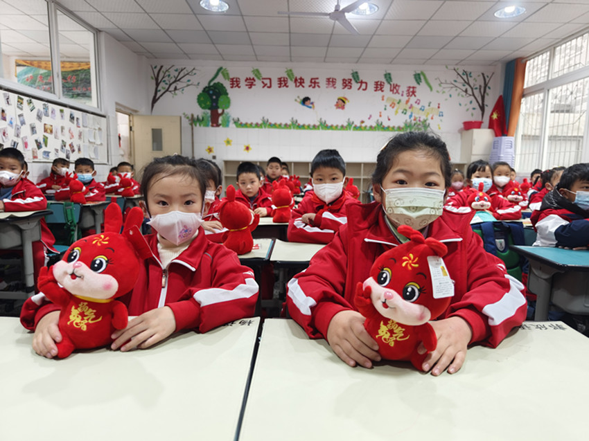 記者注意到,整個校園及各班教室都布置了精美的迎新文化墻,上面張貼懸掛著學生們在寒假生活中制作的主題創意海報。教室內,每張課桌上不僅插著寫滿祝福語的彩色氣球,還擺放著用紅絲帶打包好的新課本或一套精美文具或一只兔子玩偶,亦或是棒棒糖、旺仔牛奶等零食,均寓意新學期大吉大利、越來越棒、大展鴻“兔”、“兔”飛猛進?!斑@些別出心裁的小禮物,能給孩子們留下一個美好的記憶點,在給學生們帶來驚喜的同時,也送上一份最美、最真摯的新學期祝福!”教師黃宇虹說。