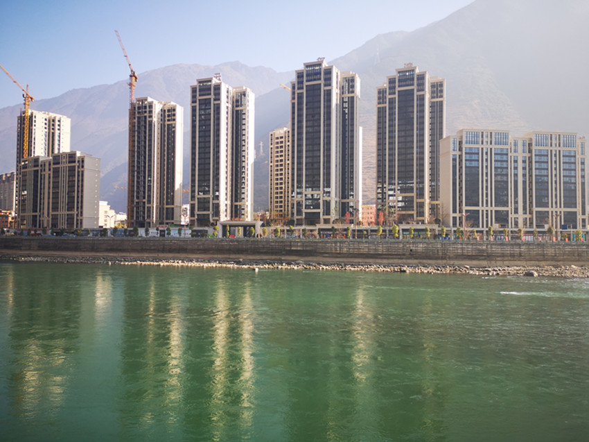 瀘定縣新城“艾威·春之陽光城”工地,3幢大樓已封頂,“第四代現代住宅垂直森林生態宜居”的概念吸人眼球。