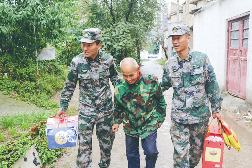 尚巴曲扎(左)與戰友看望老人。