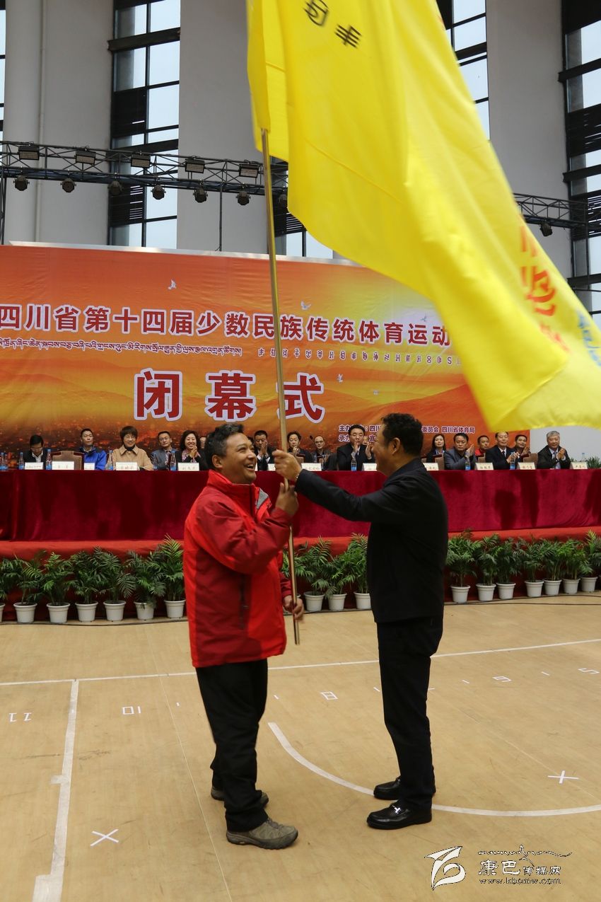 副省長(zhǎng)曲木史哈、宜賓市政府副市長(zhǎng)曾勇向我州代表團(tuán)團(tuán)長(zhǎng)、州政府副州長(zhǎng)葛寧授民運(yùn)會(huì)會(huì)旗。