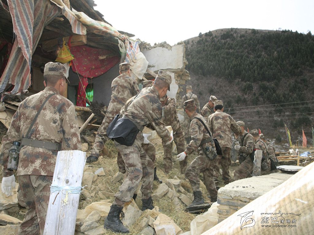 甘孜軍分區官兵為康定地震災區清理坍塌建筑。