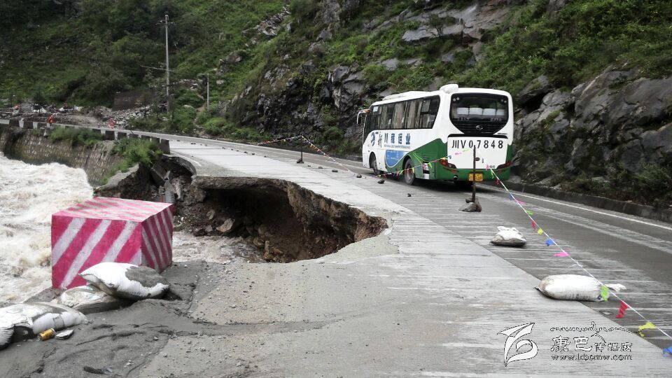 本網訊 (鄧翰卿 賀淑明文/圖)由于連降暴雨,折多河暴發山洪。9月17日上午7時20分,瀘定公路分局瓦斯溝養護站在道路巡查中發現國道318線二康路小天都路段K2824+800處路基被山洪沖毀,形成缺口。發現險情后,該分局第一時間組織人員對危險路段實行交通管制,安排專人負責在缺口上、下方向提示過往行人及車輛,并及時擬定應急搶險方案。截止目前,路基右側被沖毀路段長達45米,寬5.9米,路基被水漩空,道路混凝土面層懸空15米,僅左側車道勉強通行。因水流湍急,不利于及時恢復路基,目前該路段已實行交通管制,該分局提示過往車輛觀察、緩慢通行水毀路段。