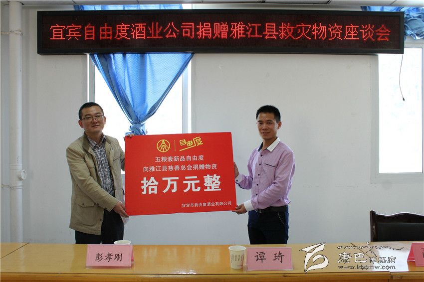 會上,彭孝剛代表宜賓自由度酒業有限公司向雅江縣慈善總會捐贈了包括救災帳篷、棉被等價值10萬元的物資。