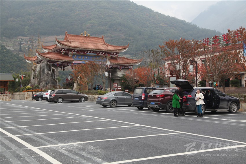 整潔的街道上,一輛輛掛著全國各地牌照的汽車來往穿梭,高大上的游客中心外,經過精心設置后已經實現了人車分流。海螺溝冰川公園大門外,深秋將櫻花樹涂成了紅色,與遠處的雪山交織成一幅油畫。