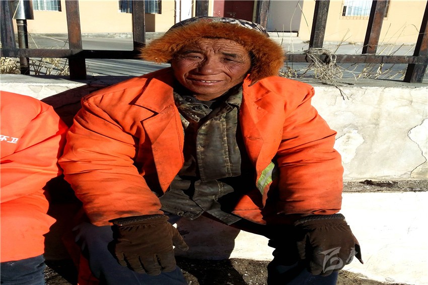 春節快到了,石渠的最低氣溫已低至零下20余攝氏度,在這呵氣成霜、滴水成冰的季節,大街小巷卻仍然能看見身穿橙色工作服還在起早貪黑地辛勞工作著的人們,他們就是石渠的環衛工人。年近60的澤仁羅布便是其中的一員,雖然他雙頰已被風霜刻畫出道道溝壑,但身體卻很硬朗,閑暇的時候他喜歡和大家在工作的附近找一處陽光充足的地方曬曬太陽、聊聊天。