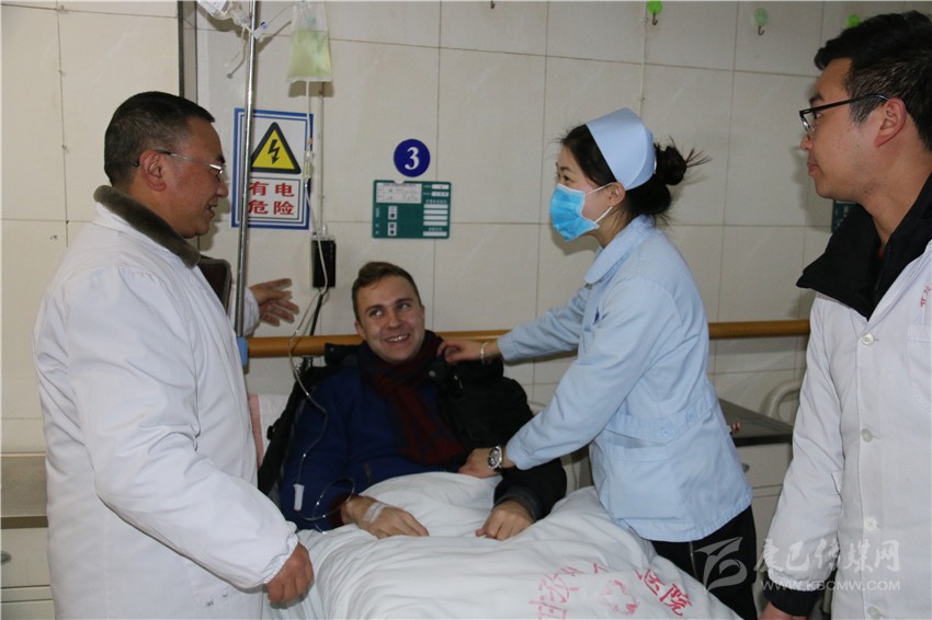和國(guó)醫(yī)生正在給臨床病人檢查病情。一位來(lái)康定玩的俄羅斯小伙因患重感冒住進(jìn)了急救中心。正在輸液的他用比較熟練的中文激動(dòng)地告訴記者:“這里的醫(yī)生服務(wù)很好,他們過(guò)年都沒(méi)有休息,我得了重感冒,經(jīng)過(guò)治療以及在他們的細(xì)心關(guān)照下,我的病情好多了。”