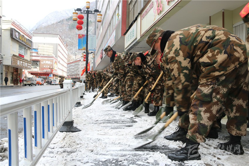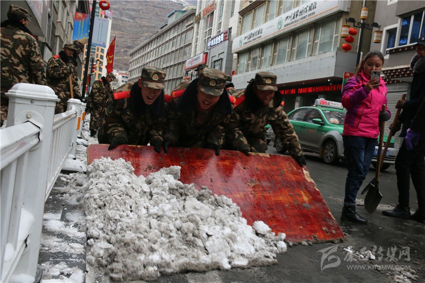經過奮戰,僅半天時間,康定市城區主要路段大面積積雪被清除一空,全體官兵又一次用實際行動踐行了“把駐地當故鄉、視人民為父母”的光榮傳統。圖為官兵正在清理路面積雪。