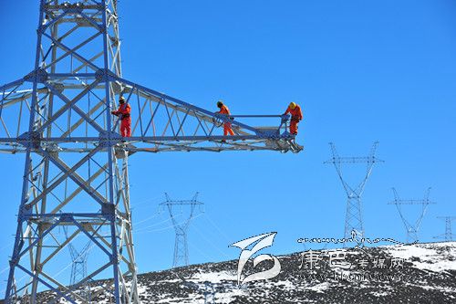 電力天路川藏聯網工程特別報道 11月中旬,寒風凜冽,滴水成冰。為確保我州“電力天路”無電地區和農網改造建設工程明年3月份按時完工 ,四川電力公司的各路建設者,依舊保持 著旺盛的工作斗志,吃住在各施工現場,奮戰在高寒缺氧地域。圖為11月12日,電力員工奮戰在雅江縣境內海拔 4412米的施工地段,登塔作業。 (楊林 攝影報道)