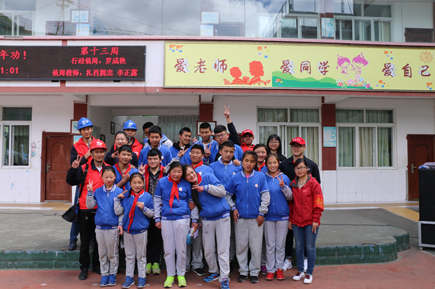 服務(wù)隊(duì)員與學(xué)生們合影留念。