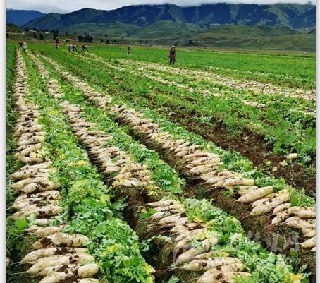 12日,記者站在海拔3600米的蘿卜種植基地,天空正飄著細雨,舉目是云霧繚繞的雪山,雨水滴落在四千多畝青綠色的蘿卜地上,白蘿卜已從土里探出頭來,似乎在等待采收。一股清甜的蘿卜味,伴隨著雨地里收割者的喜笑聲,撲面而來。