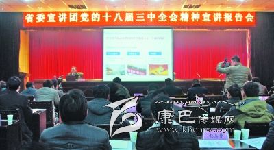 12月25日,省委宣講團在海螺溝景區宣講黨的十八屆三中全會精神,由省委講師團教授韓旭作宣講,海螺溝景區景區管理局、磨西鎮、新興鄉副科實職以上干部,21個行政村村兩委班子成員,部份州、縣人大政協代表,離退休同志代表和三老干部代表,省州屬各派駐機構負責人以及部分旅游企業負責人聆聽了報告。圖為報告會現場。(李娟 攝影報道)