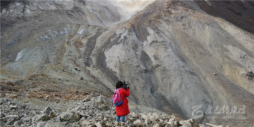 甘孜日報記者沿金沙江江底徒步前往堰塞湖,身后是清晰可見的塌方體。