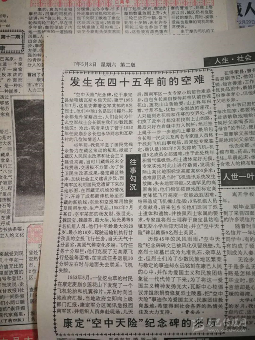 《甘孜日報》1997年5月3日第二版刊登了《發生在四十五年前的空難——康定“空中天險”紀念碑的來歷》一文,詳細記錄了1952年空軍某部9名人員駕駛運輸機執行空投飛行任務,不幸在康定地區撞山墜毀,英勇犧牲的故事。這9名烈士后被當地群眾安葬,建立“空軍墓”和“空中天險”紀念碑。 作為烈士犧牲地的甘孜多年來一直在尋找這9名烈士家屬,以圖告慰英靈。但由于線索有限,一直未有結果。
