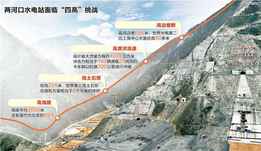 世界水電最大規(guī)模高邊坡群——兩河口水電站壩址區(qū)地形高陡,大壩兩岸的邊坡眾多,其中200—300米級工程高邊坡多達7個,300米及以上工程高邊坡5個,為世界水電最大規(guī)模高邊坡群。這對做好開挖、支護提出了嚴(yán)格要求。