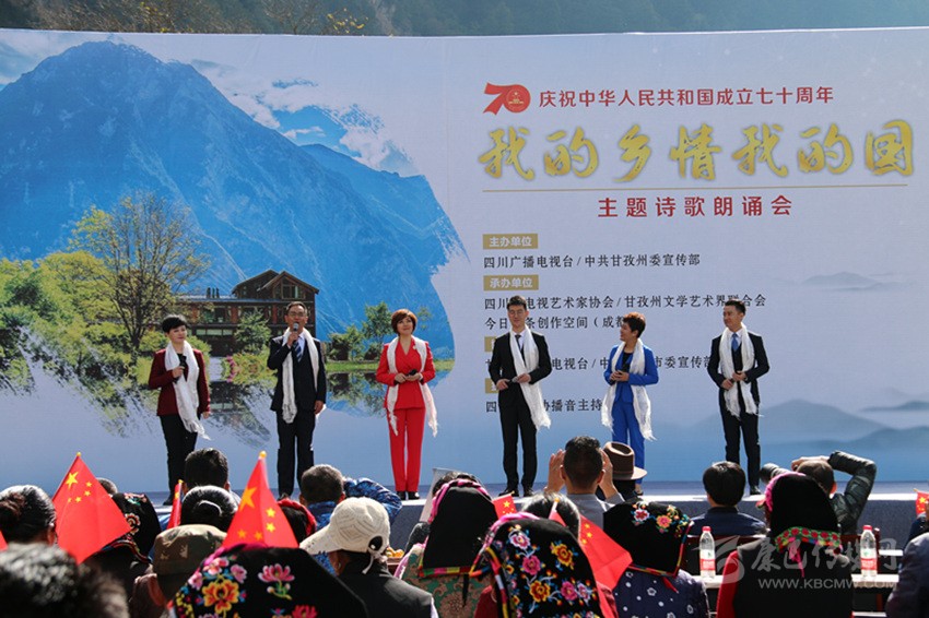 本網訊 10月16日,由省廣播電視臺、州委宣傳部聯合主辦的“我的鄉情我的國”主題詩歌朗誦會在康定市孔玉鄉色龍村圓滿落幕。20多名省內知名主持人和朗誦藝術家齊聚色龍村,以天為幕、地為臺,通過朗誦、演唱、情景表演等藝術形式歌頌美麗富饒的甘孜,展示甘孜新時代鄉村振興的美好畫卷,講述新中國成立以來發生在蜀鄉大地上的故事,獻禮中華人民共和國成立70周年。