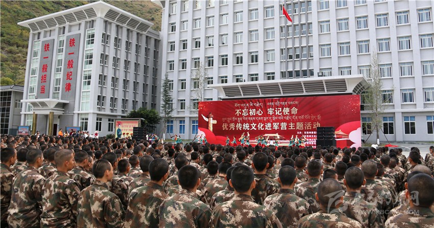 本網訊 11月9日下午,由州委宣傳部、州文化廣播電視和旅游局主辦,州文化館、州委黨史研究室、州圖書館承辦的“不忘初心、牢記使命”優秀傳統文化進軍營主題活動走進武警甘孜支隊。州民族歌舞團的歌手和演員們齊聚軍營,為官兵們送上了一場精彩絕倫的文化盛宴。