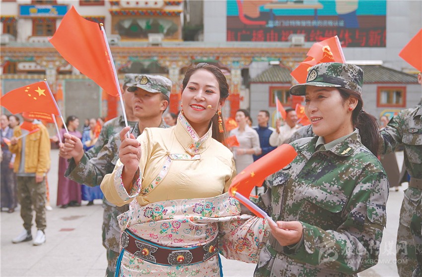 當(dāng)日下午2時(shí)許,“康定溜溜調(diào)”省級(jí)非物質(zhì)文化遺產(chǎn)傳承人毛云剛緩步走到廣場中間的建州七十年主題景觀“鍋莊篝火”旁邊,一段原生態(tài)山歌隨即從他口中傳出。“跑馬山上青松林,心上的人兒.....”仿佛從歷史深處走來的情歌,立刻吸引到游人和散步市民駐足聆聽。隨后,其美多吉和歌手們走向主題景觀,唱響名揚(yáng)全球的《康定情歌》,身著制服的各行業(yè)工作人員,循著歌聲不約而同走向廣場中央,青年志愿者們?yōu)榫蹟n上前的人們發(fā)放小國旗和印有“建州70年Logo”的小紅旗......