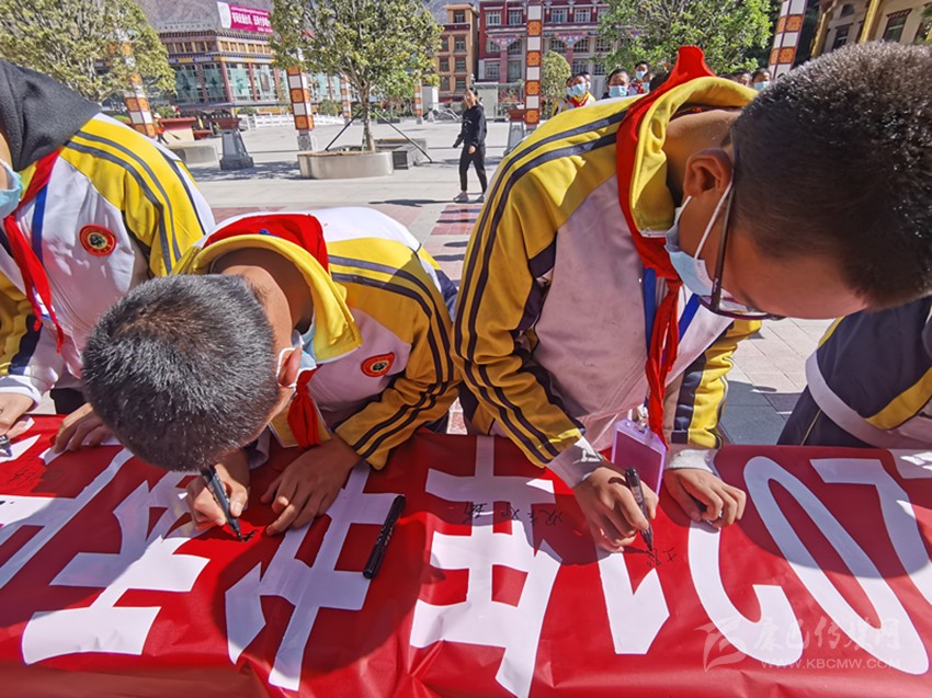 巴塘縣青少年在啟動儀式上簽字,倡導全民閱讀。