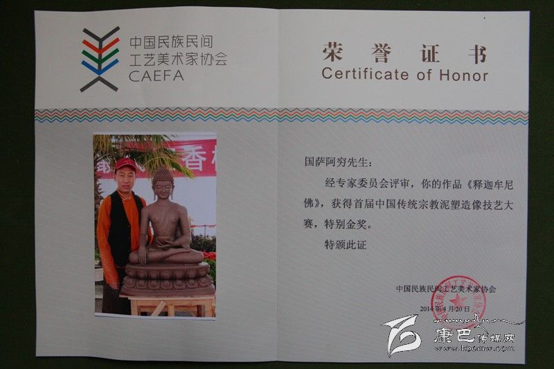 由中國民族民間工藝美術家協會主辦的“首屆中國宗教泥塑技藝大賽”,旨在傳承宗教泥塑造像技藝,搭建宗教造像藝術家展示平臺。本次大賽共有來自臺灣、香港、天津、河北、四川、西藏、云南、浙江、江蘇、貴州、江西、寧夏、江西等地的39名泥塑高手現場制作,角逐獎項。我州的國薩阿窮等三名藝人現場制作的泥塑作品《釋迦牟尼》榮獲特別金獎,同時,國薩阿窮還榮獲了“中國傳統工藝美術大師(宗教雕塑)”榮譽證書。