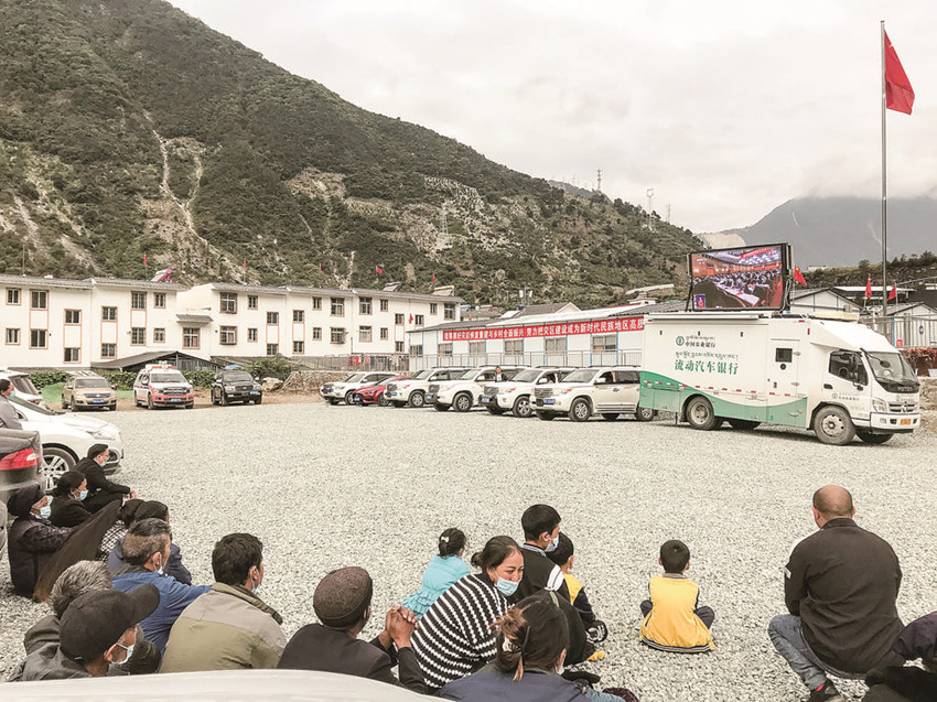 農行甘孜瀘定縣支行與群眾在流動汽車銀行前收看大會直播。