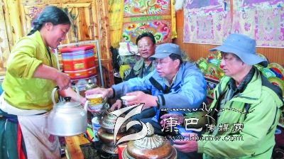 位于宗塔草原“大盆地”東邊山坡的降巴牧場在隊員們的心里也留下了深刻的印記。15日早上5點半隊員們就出發上了降巴牧場。朝霞映紅了天邊,紅云罩著青草牛糞味飄香的草坡。比采風隊員們起得更早的牧人已擠完了牛奶,一個僅10 歲的女孩正在草坡上拾牛糞;牛毛帳篷里,勤勞的牧婦已打開了牛奶分離器開始分離酥油了……一問,方知牧民們今晨4點就起床勞作,干完早上的活兒,他們要趕到三公里遠的“盆地”耍壩子,看賽馬。這個牧場靜謐潔凈得令人稱奇,青青的草坡上絕少有垃圾存留,沒見到一只兇惡的牧犬;按季節劃分的草場由整潔的網圍欄圈開,分隔有致;牧人舉家出門,連帳篷門也不掩,據說這里沒有偷盜發生,家人和諧;古老、平和的氣氛中,晨風輕拂,野花青草搖曳,輕柔的晨霧中偶而傳來兩聲牛哞,讓人頓感心靜如水。對于長期居住城市的人來說,這里無疑是“幽雅天堂”了。