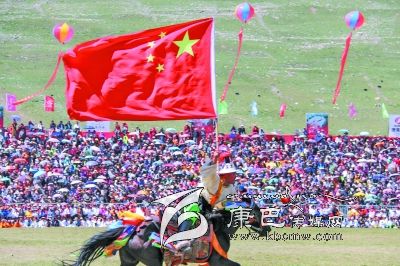 7月25日,第八屆康巴文化藝術節在玉樹藏族自治州開幕。數名參加開幕式的藏族老鄉高舉鮮艷的五星紅旗策馬狂奔,風馳電掣,跨越扎西科賽馬場,一瞬間,歡呼聲震耳欲聾,開幕式進入高潮。