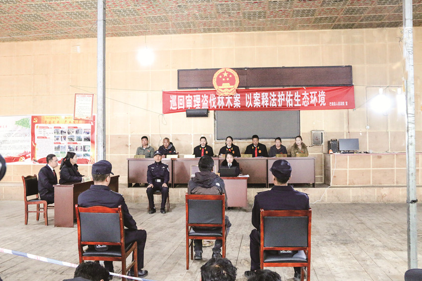 “現在開庭......”清脆的法槌聲響起,庭審正式開始。2023年6月16日,巴塘縣人民法院“小冬紅·先鋒護綠”審判團隊把3起盜伐林木案的庭審現場搬到海拔4000米的案發地波密鄉波堆村巡回審理。波密鄉林業資源豐富,盜伐林木案件頻發。為進一步擴大法治教育宣傳效果,庭審邀請轄區鄉村干部、被告人親屬、村民代表等50余人到現場旁聽。庭審現場,氣氛莊嚴,程序規范,秩序井然。公訴人陳述舉證,被告人質證認罪,審判員嚴詞教育、當庭宣判。旁聽人員零距離觀看了庭審過程,真切體會到了法律權威和違法者的慘痛教訓。“小冬紅·先鋒護綠”審判團隊與檢察、鄉鎮等部門配合,以藏漢雙語、通俗易懂的語言向前來旁聽的群眾開展現場釋法,向他們發放自制的以案釋法宣傳資料,進一步提升群眾生態保護意識、綠色環保理念,引導群眾主動參與到保護生態環境的行動中來,為法治護綠創造良好的環境。通過巡回審判,就地審理的方式,達到了“審理一案、警示一片、治理一片”的良好辦案效果。