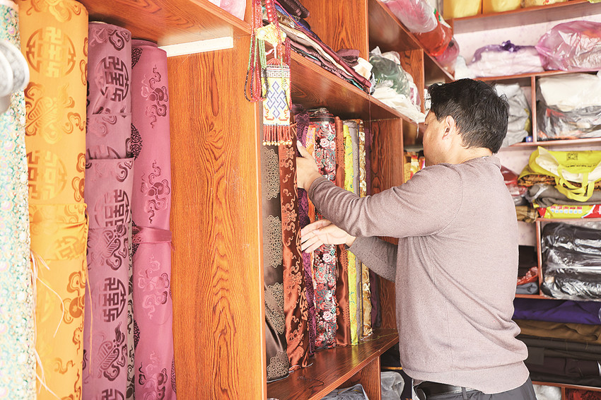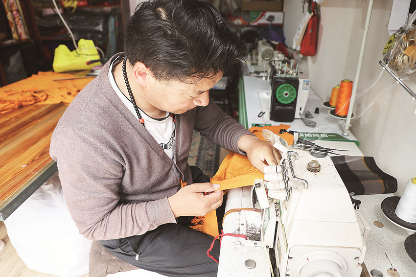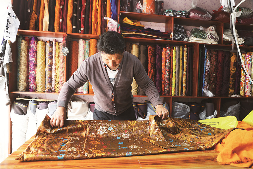 “傳統藏裝需要手工制作,青年、中年、老年人的款式各不一樣,料子也很有講究,還有裝飾也很重要……”說起登龍服飾,扎西澤仁神采飛揚,不時發出爽朗的笑聲,他說,“一般簡單的服裝制作僅需半天,復雜一些的要兩三天,價格從幾百元到幾千元不等。現在縣城的商店生意很好,每天都能接到很多訂單,在登龍鄉的鋪子交給徒弟打理也完全沒有問題。”