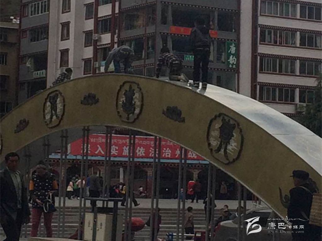 在康定劇場前面的廣場上,每天傍晚,廣場舞大叔大媽都準時前來報到。孩子們則在人群中玩耍。7歲的陽陽(化名)被奶奶帶著來到廣場上學習滑旱冰,滑著滑著小伙伴出現了。脫掉冰鞋,陽陽和大家一起開始在“康定情歌”歌譜造型的漢白玉雕塑上攀爬。奶奶則在廣場另一端和老友擺龍門陣,根本無暇顧及。“征服”了“康定情歌”以后,陽陽和伙伴們繼續“征服”康定劇場臺階前的大塊漢白玉雕塑。“趕快下去,這些娃娃真沒得家教!”一位愛管閑事的中年人制止了孩子們的“不文明”行為。他離開后,陽陽再次奔向漢白玉雕塑……