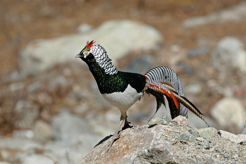 白腹錦雞(學名:Chrysolophus amherstiae):藏語譯音:甲嚇破呷妞仁 別名:銅雞、寬寬雞 國家II級保護動物,見于瀘定、康定、丹巴、九龍等。 雄鳥全長約140厘米,雌鳥約60厘米。雄鳥頭頂、背、胸為金屬翠綠色;羽冠紫紅色;后頸披肩羽白色,具黑色羽緣;下背棕色,腰轉朱紅色。飛羽暗褐色。尾羽長,有黑白相間的云狀斑紋。腹部白色。嘴和腳藍灰色。雌鳥上體及尾大部棕?