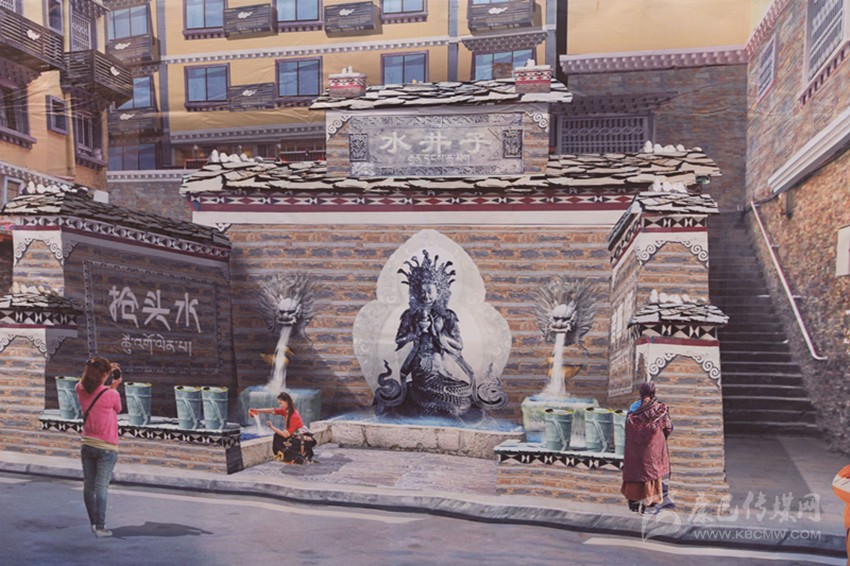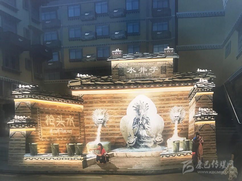 在現場,“水井子”原址已被圍擋封閉施工。根據設計,此次提升將融入“搶頭水”民族習俗,并結合互動性祈福、見證愛情的表現手法旨在將水井子打造成為康定城中的體驗式民俗景點。從外觀上看,內街水井依然采用開放式外墻,正中神龕放置藏族水龍王塑像,兩邊塑造龍頭,以“二龍噴水”景觀作為新的出水方式,下方池邊則安放傳統背水姑娘雕塑。