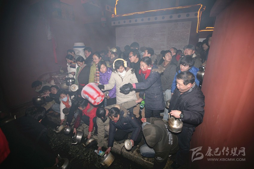 “每年大年三十我都會在這里來搶頭水,傳說郭達山神和跑馬山仙女會化身為一對金鴨在里面戲水。老人們說大年三十到正月初一‘翻年’那個節點來取水,就能看見金鴨,而水也等同于仙液。”在剛剛年滿40歲的陳先生兒時的記憶中,這里每到春節“就會有人提著水桶,拿起茶壺排起長龍來看金鴨,搶頭水。”