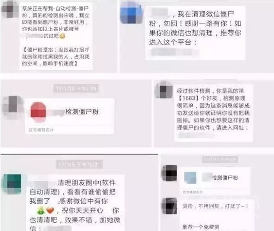 不少網友的微信都會收到類似“xxx你好,清理下朋友圈,效果不錯。真是不清不知道,一清嚇一跳。需要清理可加微信***”這樣的信息,表示可以通過專業手段找到所有刪除、拉黑、或屏蔽自己的“僵尸粉”,清理微信的聯系人,可以“釋放手機內存”。
