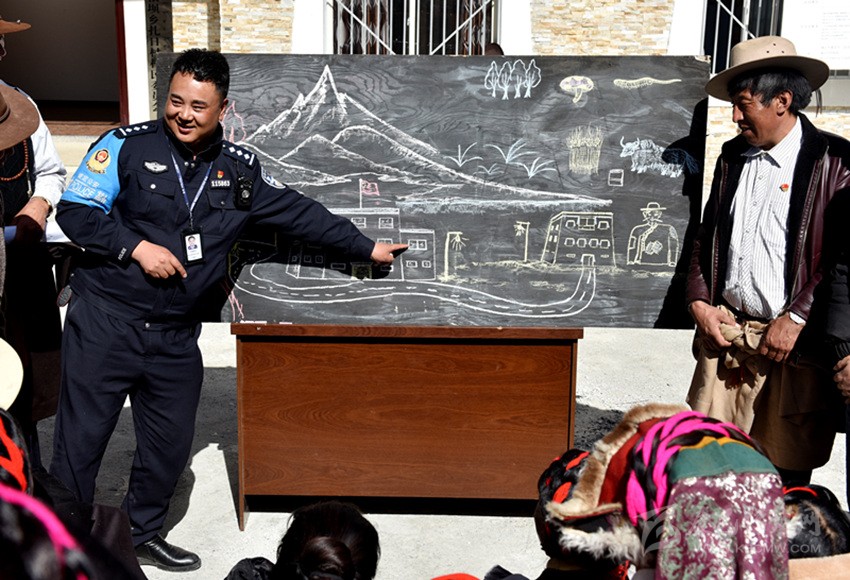 由于轄區藏族群眾大多都不識漢字、不會漢語,巴桑呷瓦便將自己的繪畫技藝運用到普法教育中,2018年10月,康定市公安局在對聯系鄉甲根壩開展精準扶貧工作時,在全市范圍內抽調了巴桑呷瓦等10名富有群眾工作經驗的民警,他一邊負責沙德鎮派出所日常工作,一邊負責兼職扎日村精準扶貧工作,用繪畫的方式為牧民群眾描繪脫貧致富夢。他把國家的相關法律法規、民族政策和惠民工程政策吃透并制作成故事性強、通俗易通的簡筆畫冊向老百姓解讀、宣講。在巴桑呷瓦妙趣橫生、詼諧幽默的“授課”下,深奧的法律政策變得淺顯易懂。“他的畫形象生動,接地氣,有我們的生產生活場景,我們喜歡看,他的講解幽默風趣,我們聽得懂,只要他一下來,村民都圍在他的身邊,舍不得離開。”扎日村的村民已經把這位“畫家”警察當作了自家人。