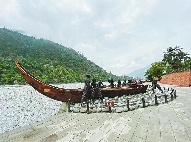 不遠(yuǎn)處的安順場渡口、大渡河邊,矗立著一座“紅軍渡”石碑,上面的三個鮮紅大字由渡河時任第一軍團(tuán)第一師一團(tuán)團(tuán)長楊得志題寫。石碑旁陳列著的一艘長10.5米、寬2.3米、高2.2米的“紅軍船”,正是當(dāng)年紅軍強渡大渡河時使用的翹首木船復(fù)制品。木船旁,是戰(zhàn)士和當(dāng)?shù)卮兿蚰敬\送武器裝備的雕像,斜坡上,勇士隊伍正奔向渡口。