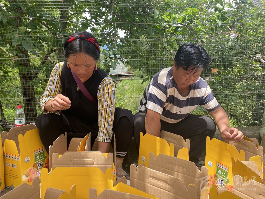 村民正在對黃桃進行統一打包裝箱。