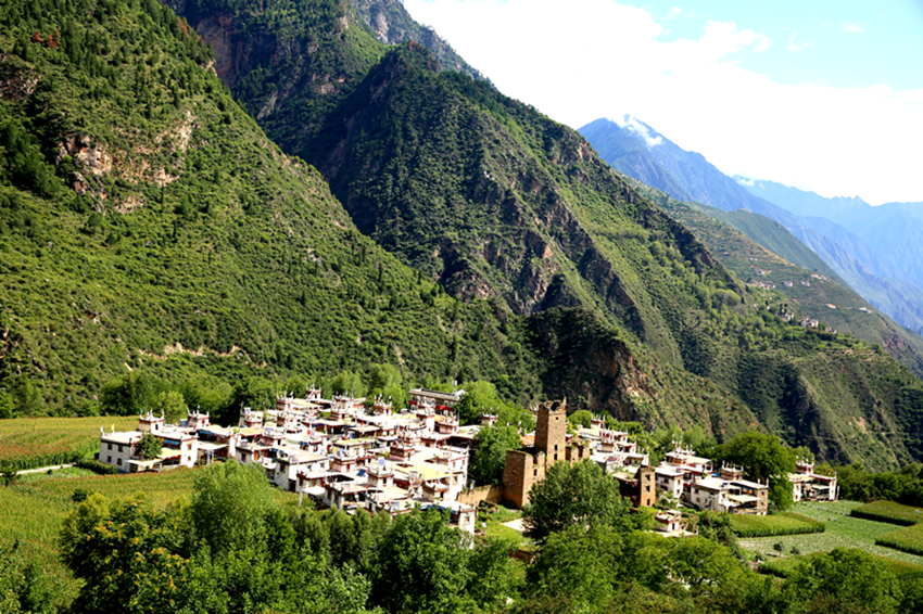 筆者一行踏上步游道,沿著綠樹成蔭的小道向著更遠處走去。當筆者一行來到制高點時,俯瞰眼前的藏寨,整個邛山寨的樣子就呈現眼前,白色的外墻,挺立的四角、層次分明的房屋,以及石木結構的房屋鱗次櫛比,錯落有致,氣勢恢宏,一幅嘉絨藏寨民居群落的美麗畫卷在我們眼前徐徐展開。